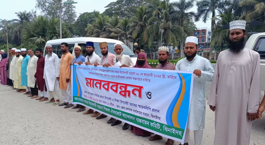 ইবতেদায়ি মাদ্রাসা জাতীয়করণের ঘোষণার দ্রুত বাস্তবায়নের দাবিতে ঝিনাইদহে মানববন্ধন কর্মসূচি পালিত হয়েছে। রোববার (তারিখ উল্লেখ করুন) সকালে জেলা প্রশাসকের কার্যালয়ের সামনে এই মানববন্ধনের আয়োজন করে স্বতন্ত্র ইবতেদায়ি মাদ্রাসা শিক্ষক ঐক্যজোট আন্দোলন বাস্তবায়ন কমিটি।