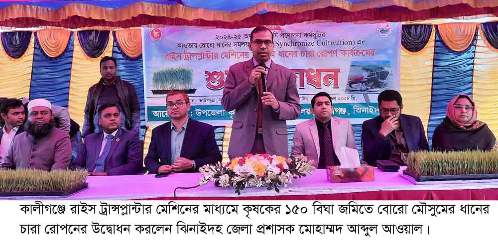 ঝিনাইদহের কালীগঞ্জে কৃষকরা এবার বিনা খরচে রাইস ট্রান্সপ্লান্টার মেশিনের মাধ্যমে বোরো মৌসুমের ধানের চারা রোপণ করেছেন। সোমবার সকালে উপজেলার ১নং সুন্দরপুর দুর্গাপুর ইউনিয়নের ছালাভরা মাঠে এ রোপণ অনুষ্ঠানের উদ্বোধন করেন ঝিনাইদহ জেলা প্রশাসক মোহাম্মদ আব্দুল আওয়াল।