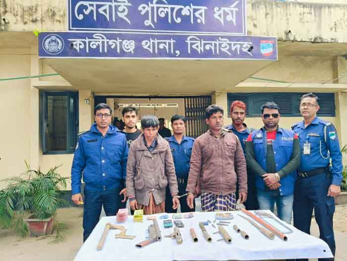 ঝিনাইদহের কালীগঞ্জ উপজেলায় যৌথ বাহিনীর অভিযানে দেশীয় আগ্নেয়াস্ত্র, রাইফেলের গুলি, চকলেট বাজি, মোবাইল, নগদ টাকা এবং অস্ত্র তৈরির সরঞ্জাম উদ্ধারসহ দুইজনকে আটক করা হয়েছে। সোমবার (২ ডিসেম্বর) দিবাগত রাত ১টার দিকে তেহরীহুদা গ্রামে পুলিশ ও সেনাবাহিনীর একটি টিম অভিযান চালিয়ে তাদের আটক করে। আটককৃত ব্যক্তিরা হলেন ওই গ্রামের রোস্তম মন্ডলের ছেলে লাল মিয়া এবং নুরুজ্জামানের ছেলে জাহাঙ্গীর আলম।