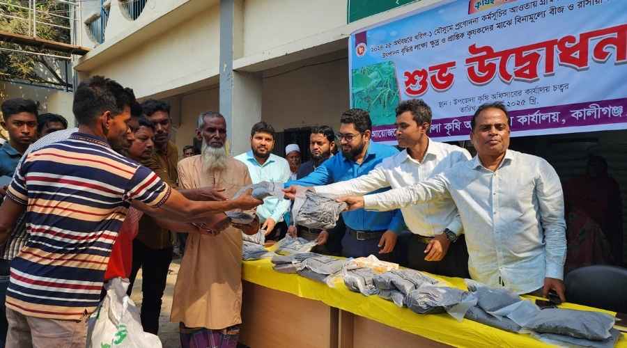 ঝিনাইদহের কালীগঞ্জ পৌরসভা সহ উপজেলার ১১টি ইউনিয়নের সাড়ে ১২ শত কৃষকের মাঝে বিনামূল্যের বীজ ও সারায়নিক সার বিতরণ করা হয়েছে। রোববার সকালে উপজেলা কৃষি অফিসের আয়োজনে বিতরন অনুষ্টানের উদ্বোধন করেন প্রধান অতিথি উপজেলা সহ-কারী কমিশনার (ভূমি) শাহিন আলম। উল্লেখ্য, ২০২৪-২৫ অর্থ বছরে খরিপ-১ মৌসুমে গ্রীস্মকালীন প্রণোদনা কর্মসূচির আওতায় উপজেলার ১ হাজার ২৫০ জন কৃষককে প্রণোদণার তিল ও মুগ ফসলের বীজ এবং সার দেওয়া হয়। এদের মধ্যে ৭৫০ জন কৃষকতে মুগ ও ৫০০ জন কৃষককে তিল বীজ এবং কৃষক প্রতি ১০ কেজি করে সার দেওয়া হয়।
