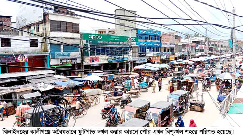 ঝিনাইদহের কালীগঞ্জ শহরের বিভিন্ন স্থানে দীর্ঘদিন ধরে অব্যবস্থাপনা, অপরিকল্পিত ও অবৈধভাবে ফুটপাত দখল করার ফলে পৌর শহর এলাকাসহ পুরো এলাকা এখন বিশৃঙ্খল শহরে পরিণত হয়েছে।