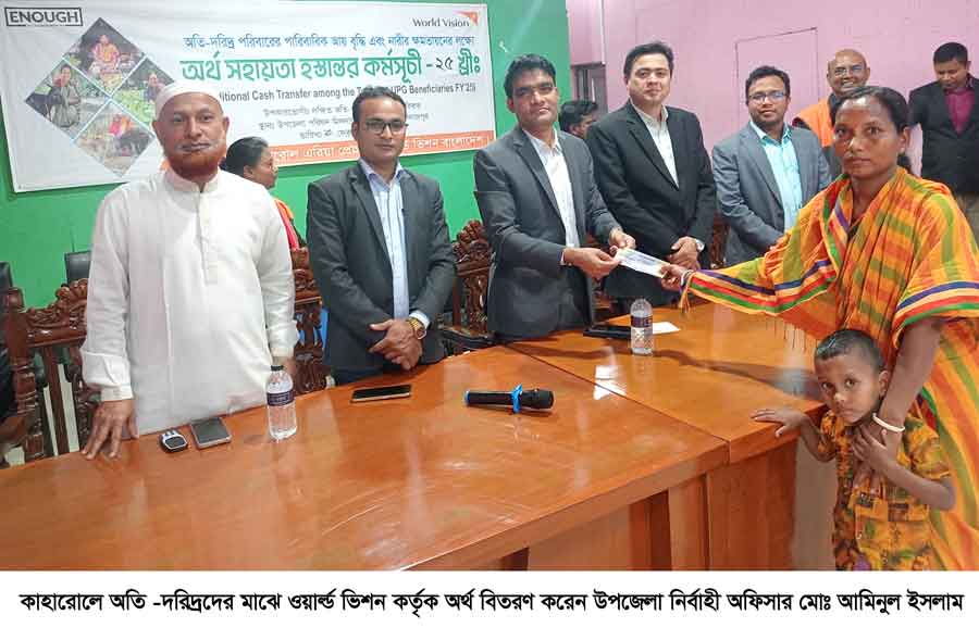 ২০ ফেব্রুয়ারি ২০২৫, বৃহস্পতিবার দিনাজপুরের কাহারোলে অতি-দরিদ্র পরিবারের পারিবারিক আয় বৃদ্ধি এবং নারীর ক্ষমতায়নের লক্ষ্যে অর্থ সহায়তা হস্তান্তর কর্মসূচী অনুষ্ঠিত হয়েছে। কাহারোল এরিয়া প্রোগ্রাম, ওয়ার্ল্ড ভিশন বাংলাদেশ-এর আয়োজনে উপজেলা অডিটোরিয়াম হল রুমে এই কর্মসূচী অনুষ্ঠিত হয়।