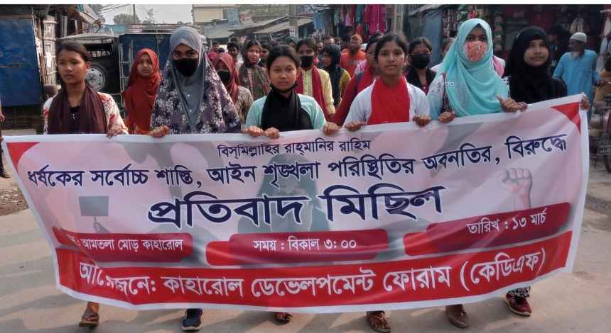 দেশের সকল ধর্ষণের বিচার ও ধর্ষকদের সর্বোচ্চ শাস্তির দাবিতে ১৩মার্চ বৃহস্পতিবার বিকেলে কাহারোল ডেভেলপমেন্ট ফোরাম এর উদ্যোগে একটি প্রতিবাদ মিছিল অনুষ্ঠিত হয়েছে।