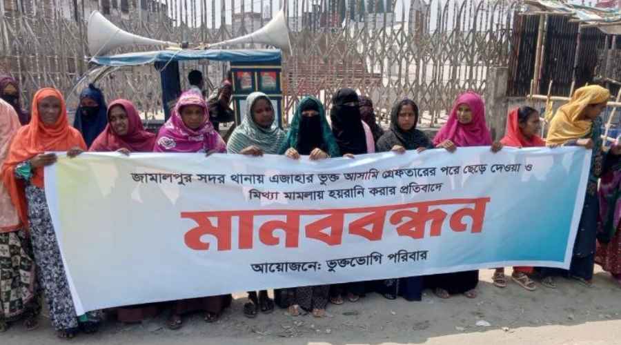 সদর থানার নাটকীয়তার জের ধরে মানববন্ধনের আয়োজন করেন বাদী পক্ষরা ৯ মার্চ রবিবার দুপুর ১২ ঘটিকার সময় জামালপুর সদর জিরো পয়েন্ট দয়াময়ি মোরে মানববন্ধনে বক্তারা তুলে দরেন এজাহার ভুক্ত আসামিকে টাকার বিনিময়ে ছেড়ে দেওয়ায় এস আই বিজন কুমার বিশ্বাস ও অফিসার ইনচার্জ আবু ফয়সাল মোঃ আতিকের প্রত্যাহার ও অতিবিলম্বে এজাহার ভুক্ত সকল আসামিদের দ্রুত গ্রেপ্তারের দাবী জানান ভুক্তভোগীর পরিবার ও মহল্লা বাসি গণ্যমান্য ব্যক্তিবর্গ। আসামি দের দ্রুত গ্রেপ্তার না হলে আরো কর্মসূচি পালন করবে বলে ঘোষণা দেন,সেই সাথে জেলা প্রশাসক বরাবর এবং জেলা পুলিশ সুপার বরাবর সরকলিপি প্রধান করিবেন বলে জানান মানববন্ধনের বক্তারা।
