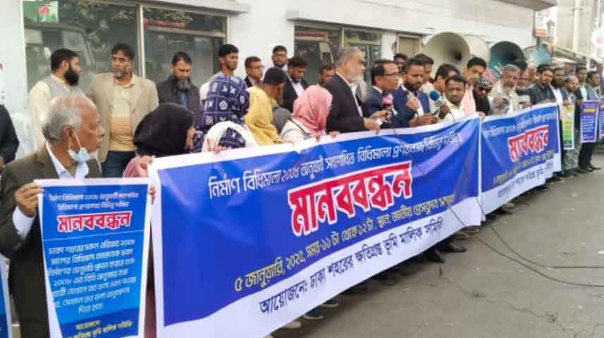 ঢাকা শহরের বিভিন্ন এলাকায় ভবন নির্মাণের অনুমতি প্রদান এবং ২০০৮ সালের নির্মাণ বিধিমালা অনুযায়ী রাস্তা অনুযায়ী ভবন উচ্চতার অনুমোদনসহ পাঁচ দফা দাবি জানিয়েছে "ঢাকা শহরের ক্ষতিগ্রস্ত ভূমি মালিক সমিতি"। রোববার (৫ জানুয়ারি) জাতীয় প্রেস ক্লাবের সামনে আয়োজিত এক মানববন্ধনে এসব দাবি উত্থাপন করা হয়।