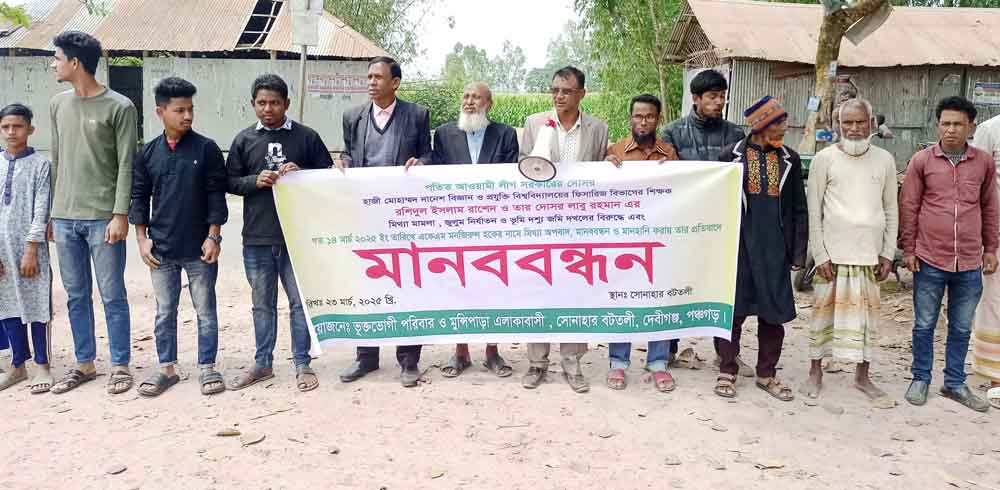ভুক্তভোগী একেএম মনজিরুল হকসহ দেবীগঞ্জ সদর ইউনিয়নের সোনাহার পূর্ব মুন্সিপাড়া এলাকার লোকজন এ মানববন্ধন কর্মসূচির আয়োজন করে।