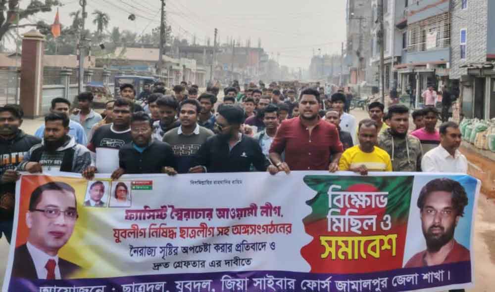 ফ্যাসিস্ট স্বৈরাচার আওয়ামী লীগের নৈরাজ্য সৃষ্টির অপচেষ্টা ও সন্ত্রাসীদের দ্রুত গ্রেফতারের দাবিতে জামালপুরে বিক্ষোভ মিছিল ও সমাবেশ অনুষ্ঠিত হয়েছে।