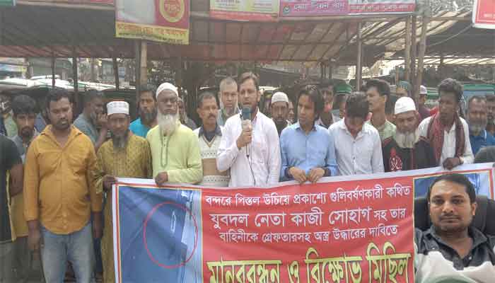 বন্দরে প্রকাশ্যে গুলিবর্ষণকারী কথিত যুবদল নেতা কাজী সোহাগ ও তার বাহিনীকে গ্রেপ্তার এবং অস্ত্র উদ্ধারের দাবিতে মানববন্ধন ও বিক্ষোভ মিছিল অনুষ্ঠিত হয়েছে।