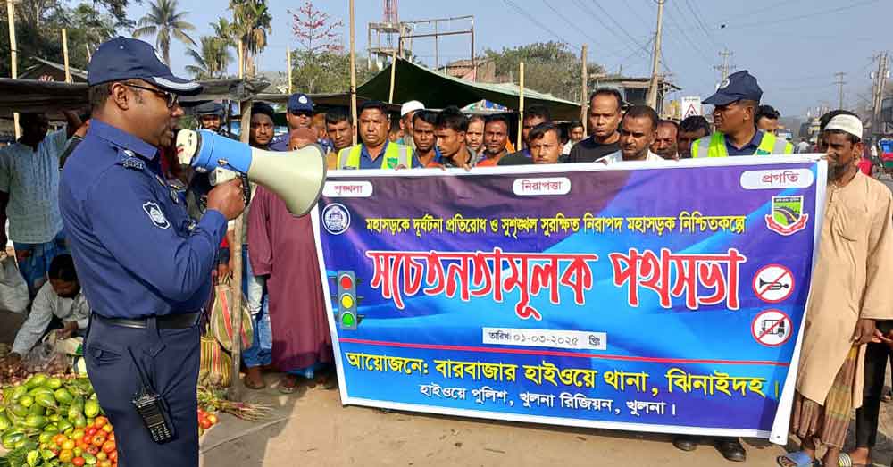 ঝিনাইদহ-যশোর মহাসড়কের দূর্ঘটনা প্রতিরোধ ও সুশৃঙ্খল-সুরক্ষিত নিরাপদ সড়ক নিশ্চিত করনে সচেতনামূলক পথসভা অনুষ্ঠিত হয়েছে। শনিবার (১ মার্চ) সকালে সাতমাইল ও চুরামনকাঠি বাজারে বারবাজার হাইওয়ে পুলিশের পক্ষ থেকে এই সচেতনতামূলক পথসভার আয়োজন করা হয়।