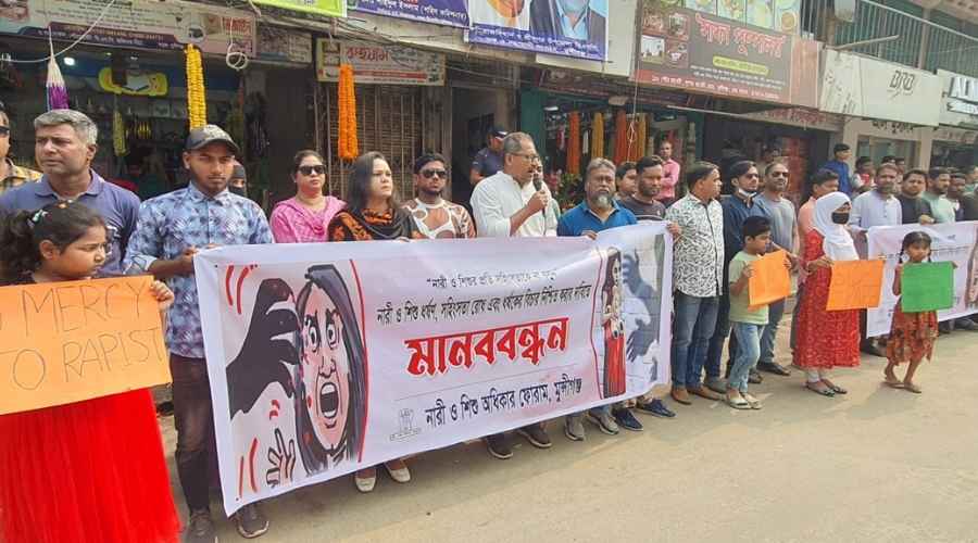 নারী ও শিশু ধর্ষণ, সহিংসতা রোধ এবং ধর্ষকের বিচার নিশ্চিত করার দাবিতে মুন্সীগঞ্জে মানববন্ধন ও সমাবেশ হয়েছে। গতকাল শুক্রবার সকালে নারী ও শিশু অধিকার ফোরাম, মুন্সীগঞ্জ জেলা শাখার উদ্যোগে এই কর্মসূচি পালন করা হয়। সংগঠনের সভাপতি সোনিয়া হাবিব লাবনীর সভাপতিত্বে অনুষ্ঠানে বক্তব্য রাখেন, সাবেক কমিশনার মোহাম্মদ আলী লিটন, জেলা যুবদলের সদস্য সচিব মোহাম্মদ মাসুদ রানা, জেলা নারী ও শিশু অধিকার ফোরামের সহ-সভাপতি মোজাম্মেল হোসেন সজল, সহ-সভাপতি মাসুদুর রহমান, সহ সাংগঠনিক সম্পাদক এম.এম.রহমান, মো. শাহীন মিয়া, সাহিত্য বিষয়ক সম্পাদক শাহনাজ হীরা, সদস্য জান্নাতুল বাকিয়া,২ নং ওয়ার্ড বিএনপির সভাপতি মোশারফ হোসেন, ৩ নং ওয়ার্ড বিএনপির সাধারণ সম্পাদক মো. টগর, ৭ নং ওয়ার্ড বিএনপির সাংগঠনিক সম্পাদক মো. আক্তার হোসেন, জেলা ছাত্রদলের সাবেক ভারপ্রাপ্ত সাধারণ হুমায়ুন আহমেদ, সদর ও শহর ছাত্রদলের সাবেক সভাপতি মো. মহসিন, বিএনপি নেতা শাহআলম, সুজন খান,যুবদল নেতা মো. ইকবাল, মজিবুর রহমান চঞ্চল, মাসুদ পারভেজ খান, আরাফাত রহমান কোকো স্মৃতি সংসদের আহ্বায়ক শিপলু প্রমুখ। মানববন্ধনে বক্তারা নারী ও শিশু ধর্ষণকারীদের সর্বোচ্চ শাস্তি প্রকাশ্যে মৃত্যুদন্ডের দাবি জানান।
