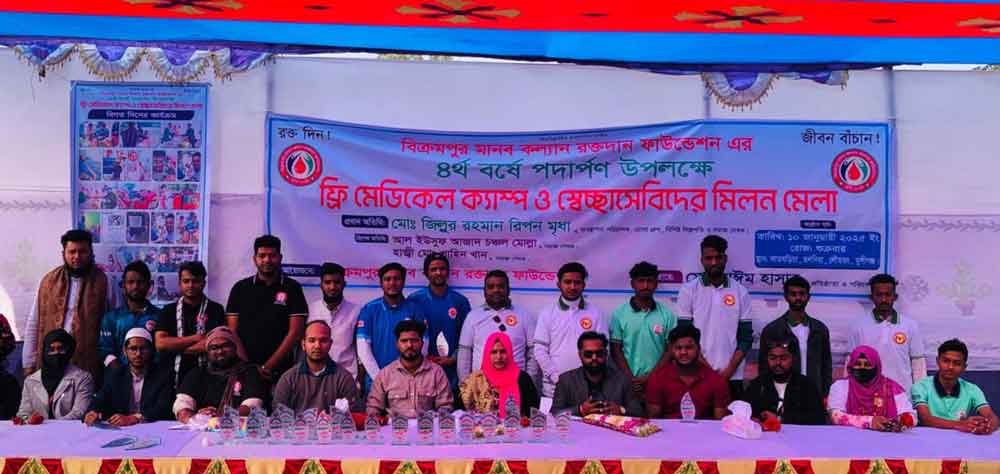 মুন্সীগঞ্জের লৌহজং উপজেলার বিক্রমপুর মানব কল্যাণ রক্তদান ফাউন্ডেশন তার চতুর্থ বর্ষপূতি উপলক্ষে এক আয়োজন করেছে। ১০ জানুয়ারি শুক্রবার হলদিয়া ইউনিয়নের সাতঘরিয়া মাঠে অনুষ্ঠিত এই অনুষ্ঠানটি ছিল ফ্রি মেডিকেল ক্যাম্প এবং স্বেচ্ছাসেবীদের মিলন মেলা।