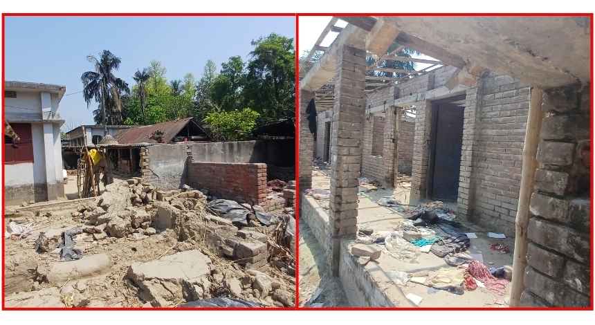 চারদিকে ধ্বংসস্তূপ আর ছড়িয়ে থাকা ইট, কাঠ, ও ভাঙা আসবাবপত্রের দৃশ্য দেখে মনে হবে যেন যুদ্ধবিধ্বস্ত কোনো এলাকা।