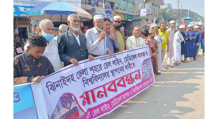 ঝিনাইদহ জেলা শহরে রেল লাইন, মেডিকেল কলেজ ও কৃষি বিশ্ববিদ্যালয় স্থাপনের দাবিতে ঘন্টাব্যাপী মানববন্ধন কর্মসূচি পালন করা হয়েছে। শনিবার সকালে শহরের পায়রা চত্বরে এই মানববন্ধনের আয়োজন করে রেললাইন, মেডিকেল কলেজ ও বিশ্ববিদ্যালয় বাস্তবায়ন কমিটি। কর্মসূচিতে ব্যানার–ফেস্টুন হাতে বিভিন্ন সামাজিক, সাংস্কৃতিক সংগঠনের নেতৃবৃন্দসহ নানা শ্রেণী–পেশার মানুষ অংশ নেন।