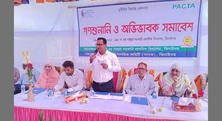 ‘দুর্নীতির বিরুদ্ধে একসাথে’—এই শ্লোগানকে সামনে রেখে ঝিনাইদহে অনুষ্ঠিত হয়েছে দুর্নীতিবিরোধী গণশুনানি ও অভিভাবক সমাবেশ। বুধবার সকালে সদর উপজেলার চরখাজুরা সরকারি প্রাথমিক বিদ্যালয় প্রাঙ্গণে সচেতন নাগরিক কমিটি (সনাক) এ অনুষ্ঠানের আয়োজন করে।