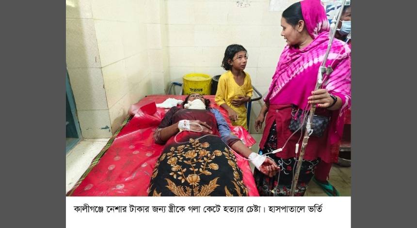 ঝিনাইদহের কালীগঞ্জে নেশার টাকার জন্য নিজের স্ত্রীকে হত্যার চেষ্টা করেছেন এক মাদকাসক্ত ব্যক্তি। মঙ্গলবার দুপুরে পৌর শহরের আড়পাড়া নদী পাড়ায় এই ঘটনা ঘটে। মুমুর্ষ অবস্থায় হালিমা খাতুন (৩২) নামের গৃহবধূকে উদ্ধার করে প্রথমে কালীগঞ্জ উপজেলা স্বাস্থ্য কমপ্লেক্সে এবং পরে যশোর সদর হাসপাতালে রেফার্ড করা হয়েছে।