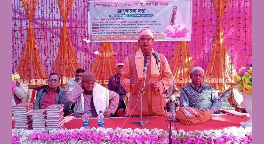দিনাজপুরের কাহারোলে গভীর ভক্তি ও ধর্মীয় ভাবগাম্ভীর্যের মধ্য দিয়ে পালিত হয়েছে শ্রী মা সারদা দেবীর ১৭৩তম জন্মতিথি। ১২ ডিসেম্বর ২০২৫, শুক্রবার খোশালপুর রামকৃষ্ণ আশ্রমের আয়োজনে সারাদিনব্যাপী নানা ধর্মীয় আয়োজনের পাশাপাশি আশ্রম মাঠ প্রাঙ্গণে অনুষ্ঠিত হয় এক আলোচনা সভা। ভোর থেকেই আশ্রম প্রাঙ্গণে ভক্তদের ঢল নেমে আসে। শান্ত, পরিবেশময় অনুষ্ঠানে উপস্থিত হাজারো মানুষ মা সারদা দেবীর তপস্যা, আদর্শ ও মানবতাবোধ স্মরণ করে ভক্তিমগ্ন হয়ে ওঠেন।