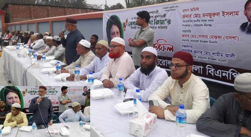 দিনাজপুরের কাহারোল উপজেলায় বাংলাদেশ জাতীয়তাবাদী দল (বিএনপি) এর উদ্যোগে ইফতার ও দোয়া মাহফিল অনুষ্ঠিত হয়েছে। সোমবার (৯ মার্চ ২০২৬) বিকেলে কাহারোল পাইলট বালিকা উচ্চ বিদ্যালয় সংলগ্ন শহিদুলের চাতালে এ ইফতার মাহফিলের আয়োজন করা হয়। তৃণমূল নেতাকর্মীদের স্বতঃস্ফূর্ত অংশগ্রহণে পুরো অনুষ্ঠানটি এক মিলনমেলায় পরিণত হয়।
