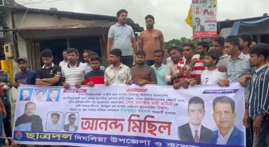 ঢাকা বিশ্ববিদ্যালয় কেন্দ্রীয় ছাত্র সংসদ (ডাকসু) নির্বাচনে ছাত্রদলের মনোনীত প্রার্থী ঘোষণা করায় খুলনার দিঘলিয়া উপজেলা ছাত্রদল ও কলেজ শাখা ছাত্রদলের উদ্যোগে আনন্দ মিছিল অনুষ্ঠিত হয়েছে। বৃহস্পতিবার (২১ আগস্ট) বিকেল ৫টায় উপজেলা সদরে এ মিছিল অনুষ্ঠিত হয়।