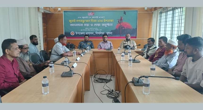 খুলনার দিঘলিয়া উপজেলা পরিষদ হলরুমে ‘জুলাই গণঅভ্যুত্থান দিবস ২০২৫’ উপলক্ষে উপজেলা প্রশাসনের আয়োজনে আলোচনা সভা ও দোয়া মাহফিল অনুষ্ঠিত হয়েছে। মঙ্গলবার সকাল ১১টায় অনুষ্ঠিত এ অনুষ্ঠানে সভাপতিত্ব করেন উপজেলা নির্বাহী অফিসার আরিফুল ইসলাম।