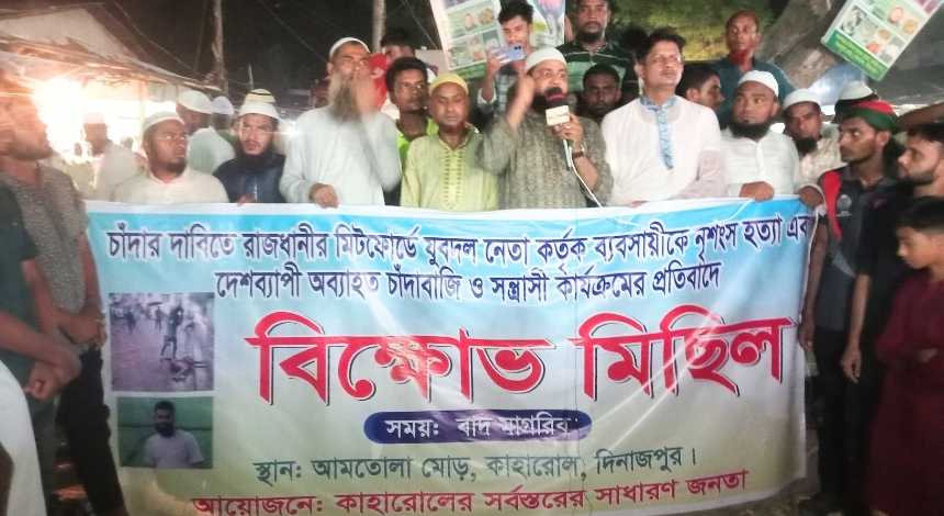 রাজধানীর মিটফোর্ড এলাকায় চাঁদার দাবিতে যুবদল নেতার হাতে এক ব্যবসায়ীকে নৃশংস হত্যাসহ সারাদেশে চলমান চাঁদাবাজি ও সন্ত্রাসী কর্মকাণ্ডের প্রতিবাদে দিনাজপুরের কাহারোলে সর্বস্তরের সাধারণ মানুষের উদ্যোগে এক বিক্ষোভ মিছিল ও প্রতিবাদ সভা অনুষ্ঠিত হয়েছে।