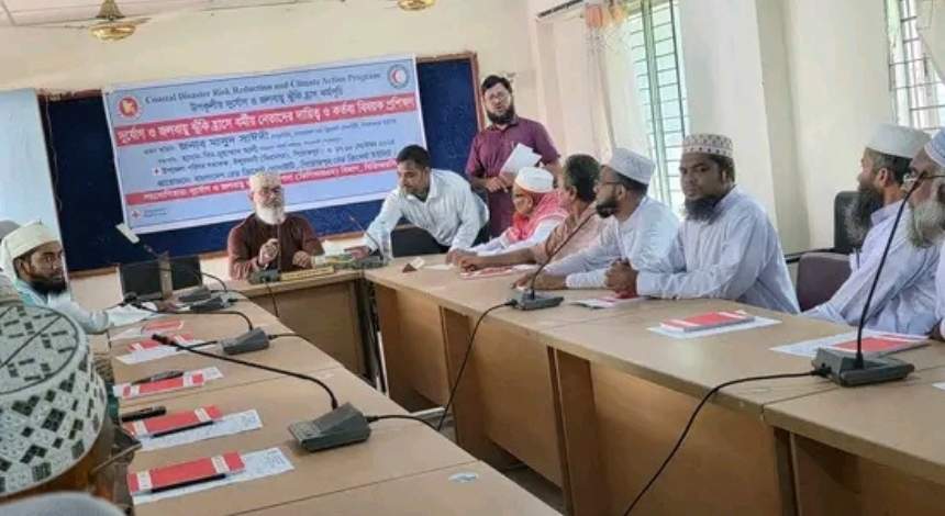 বাংলাদেশ রেড ক্রিসেন্ট সোসাইটি পিরোজপুর জেলা ইউনিটের আওতায় এবং দুর্যোগ ও জলবায়ু ঝুঁকি ব্যবস্থা (ডিসিআরএম) বিভাগের সহযোগিতায় দুই দিনব্যাপী “দুর্যোগ ও জলবায়ু ঝুঁকি হ্রাসে ধর্মীয় নেতাদের দায়িত্ব ও কর্তব্য” শীর্ষক প্রশিক্ষণ কর্মশালা অনুষ্ঠিত হয়েছে। বুধবার (১৭ সেপ্টেম্বর) সকালে উপজেলা হলরুমে কর্মশালার উদ্বোধন করা হয়।