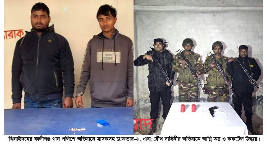 ঝিনাইদহের কালীগঞ্জ উপজেলায় পুলিশের পৃথক অভিযানে মাদক, অস্ত্র ও ককটেল উদ্ধার করা হয়েছে। এসব অভিযানে দুইজনকে গ্রেফতার করা হয়েছে। উদ্ধার হওয়া আলামতের মধ্যে রয়েছে ইয়াবা ট্যাবলেট, একটি একনলা বন্দুক ও দুটি ককটেল। পুলিশ জানিয়েছে, গ্রেফতারদের বিরুদ্ধে মাদকদ্রব্য ও অস্ত্র আইনে একাধিক মামলা দায়ের করা হয়েছে।