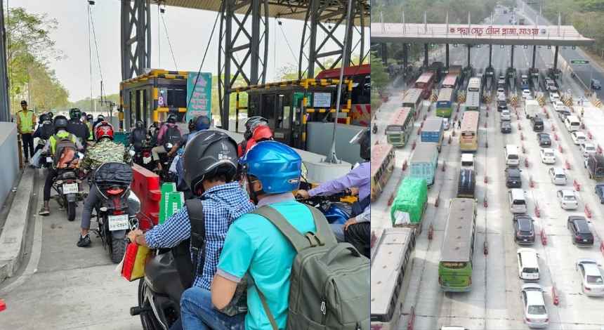 মঙ্গলবার (১৭ মার্চ) সকালে মুন্সীগঞ্জের লৌহজং উপজেলার মাওয়া টোল প্লাজা এলাকায় সরেজমিনে দেখা যায়, দক্ষিণবঙ্গমুখী যানবাহনের সংখ্যা কিছুটা বেড়েছে। টোল প্লাজার সামনে সামান্য লাইনের সৃষ্টি হলেও দ্রুত টোল আদায়ের কারণে যান চলাচলে কোনো দীর্ঘস্থায়ী বিঘ্ন ঘটছে না।