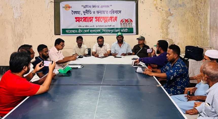 পিরোজপুরে "বৈষম্য, দুর্নীতি ও অন্যায়"-এর বিরুদ্ধে গ্রীন ফোর্স বাংলাদেশের উদ্যোগে এক সংবাদ সম্মেলন অনুষ্ঠিত হয়েছে। শনিবার (২৫ অক্টোবর) দুপুরে বিশ্ববিদ্যালয় ক্লাবে আয়োজিত এই সংবাদ সম্মেলনে সংগঠনের নেতৃবৃন্দ প্রশাসনিক ও উন্নয়নমূলক বৈষম্যের কঠোর প্রতিবাদ জানান।