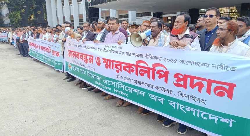 খুচরা সার বিক্রেতা আইডি কার্ডধারীদের বহাল রাখা, টি.ও লাইসেন্স কার্যকর রাখা এবং সার সংক্রান্ত নীতিমালা ২০২৫ সংশোধনের দাবিতে ঝিনাইদহে মানববন্ধন ও স্মারকলিপি প্রদান করেছে খুচরা সার বিক্রেতা এসোসিয়েশন অব বাংলাদেশ। রোববার সকালে জেলা প্রশাসকের কার্যালয়ের সামনে সংগঠনটি এ কর্মসূচির আয়োজন করে।