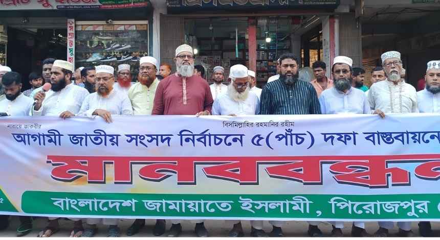 সুষ্ঠু ও নিরপেক্ষ নির্বাচনের লক্ষ্যে আনুপাতিক প্রতিনিধিত্বমূলক (পিআর) পদ্ধতি প্রবর্তনসহ পাঁচ দফা দাবি আদায়ের উদ্দেশ্যে পিরোজপুরে মানববন্ধন কর্মসূচি পালন করেছে জেলা জামায়াতে ইসলামী।