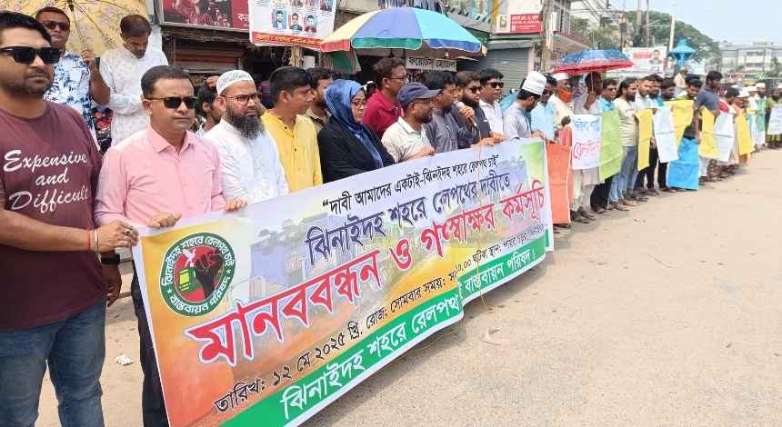 ঝিনাইদহ শহরে রেললাইন স্থাপনের দাবিতে মানববন্ধন ও গণস্বাক্ষর কর্মসূচি অনুষ্ঠিত হয়েছে। সোমবার (১২ মে) সকালে শহরের পায়রা চত্বরে রেলপথ বাস্তবায়ন পরিষদের আয়োজনে এই কর্মসূচি পালিত হয়।