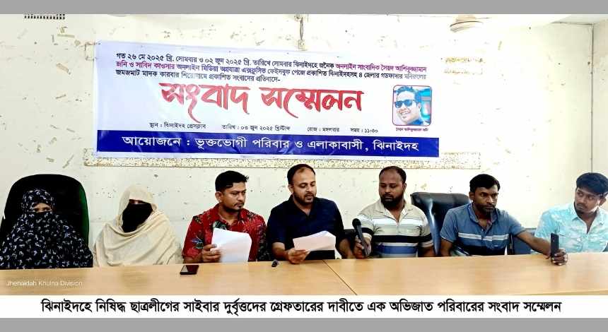 ঝিনাইদহে নিষিদ্ধ ছাত্রলীগের পরিচয়ধারী কিছু সাইবার দুর্বৃত্তের অপপ্রচারের বিরুদ্ধে এক সম্মানিত ও অভিজাত পরিবার সংবাদ সম্মেলন করে প্রতিকার দাবি করেছে। চাঁদা না দেওয়ার অপরাধে মিথ্যা তথ্য, ভুয়া ফেসবুক আইডি ও মানহানিকর প্রচারে অতিষ্ঠ হয়ে মঙ্গলবার দুপুরে ঝিনাইদহ প্রেসক্লাবে এই সংবাদ সম্মেলনের আয়োজন করা হয়।