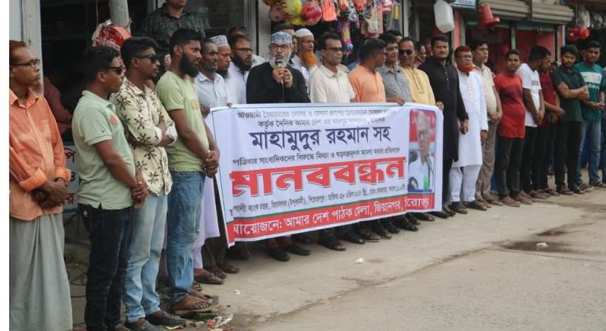 পিরোজপুরের জিয়ানগরে সাংবাদিক মাহমুদুর রহমানসহ সকল সাংবাদিকদের বিরুদ্ধে ষড়যন্ত্রমূলক ও মিথ্যা মামলা প্রত্যাহারের দাবিতে মানববন্ধন কর্মসূচি অনুষ্ঠিত হয়েছে।