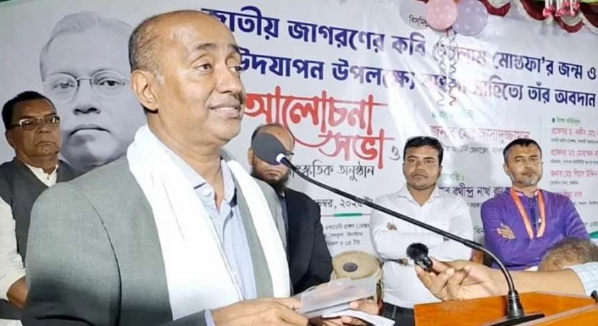 শুক্রবার (১৪ নভেম্বর) বিকেল ৪টায় ঝিনাইদহের শৈলকূপার মনোহরপুর গ্রামে জাতীয় জাগরণের কবি গোলাম মোস্তফার জন্ম ও মৃত্যুদিবস উপলক্ষে আয়োজিত আলোচনা সভা ও সাংস্কৃতিক অনুষ্ঠানে প্রধান অতিথির বক্তব্যে তিনি এসব কথা বলেন। কবির পৈতৃক ভিটায় আয়োজিত এই আয়োজনকে ঘিরে ছিল উৎসবমুখর পরিবেশ।
