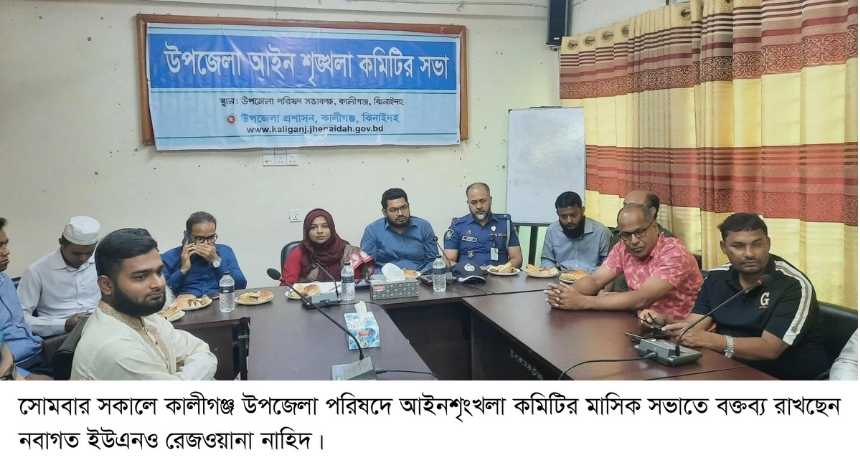 ঝিনাইদহের কালীগঞ্জ উপজেলা নির্বাহী অফিসার (ইউএনও) রেজওয়ানা নাহিদ দায়িত্ব গ্রহণের পর প্রথমবারের মতো উপজেলা আইনশৃঙ্খলা কমিটির মাসিক সভায় যোগ দেন। সভায় তিনি বলেন, “আমি সদ্য যোগদান করেছি। এই উপজেলার আইনশৃঙ্খলা নিয়ন্ত্রণসহ উন্নয়নের সব ক্ষেত্রে আপনাদের আন্তরিক সহযোগিতা চাই। আপনাদের সহায়তায় আমরা কালীগঞ্জকে আরও উন্নত, নিরাপদ ও সুন্দর করে গড়ে তুলতে পারব।”