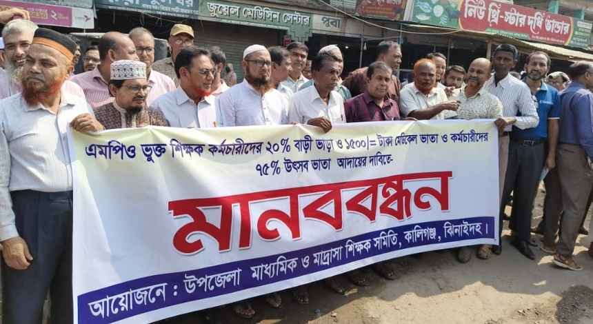 উপজেলা মাধ্যমিক ও মাদ্রাসা শিক্ষক সমিতির আয়োজনে অনুষ্ঠিত মানববন্ধনে উপজেলার বিভিন্ন স্কুল, কলেজ ও মাদ্রাসার শত শত শিক্ষক-কর্মচারী অংশগ্রহণ করেন। তারা ২০ শতাংশ বাড়ি ভাতা, ১,৫০০ টাকা মেডিকেল ভাতা এবং কর্মচারীদের ৭৫ শতাংশ উৎসব ভাতা প্রদানের দাবি জানান।