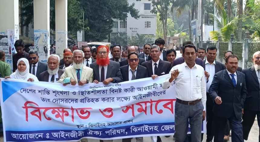 সারাদেশে চলমান নৈরাজ্য ও রাজনৈতিক অস্থিতিশীলতার প্রতিবাদে ঝিনাইদহে আইনজীবী ঐক্যপরিষদের উদ্যোগে বিক্ষোভ মিছিল ও সমাবেশ অনুষ্ঠিত হয়েছে। বুধবার সকাল সাড়ে ১০টার দিকে জেলা আইনজীবী সমিতির কার্যালয়ের সামনে থেকে এ কর্মসূচি শুরু হয়।