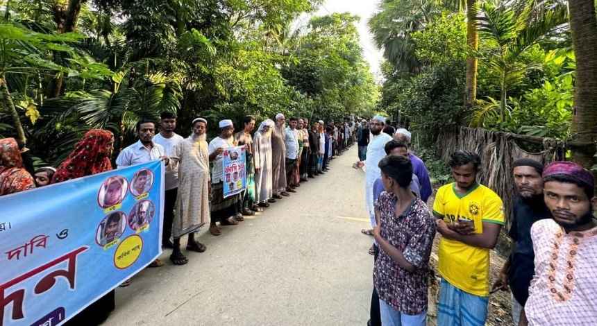 পিরোজপুরের মঠবাড়িয়া থেকে পটুয়াখালীর মহিপুরে মাছ ধরতে গিয়ে নৃশংস হত্যার শিকার হেলাল হাওলাদারের (২৪) খুনিদের গ্রেফতার ও ফাঁসির দাবিতে মানববন্ধন অনুষ্ঠিত হয়েছে। শুক্রবার (২৬ সেপ্টেম্বর) বিকালে তুষখালী ইউনিয়নের ছোটমাছুয়া গ্রামে পাঁচ শতাধিক নারী-পুরুষ এ মানববন্ধনে অংশ নেন। নিহত হেলাল ওই গ্রামের হারুন হাওলাদারের ছেলে।