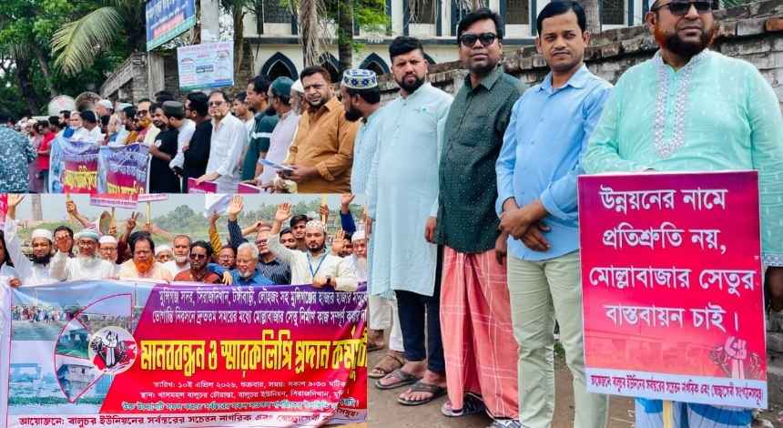 মুন্সীগঞ্জের সিরাজদিখান উপজেলা এবং ঢাকার দক্ষিণ কেরাণীগঞ্জের মধ্যকার গুরুত্বপূর্ণ যোগাযোগ মাধ্যম হিসেবে পরিকল্পিত মোল্লাবাজার সেতু—যা নির্মিত হলে হাজারো মানুষের যাতায়াত সহজ হওয়ার কথা—তা দীর্ঘ ৯ বছরেও আলোর মুখ দেখেনি। ফলে প্রতিদিন চরম দুর্ভোগে পড়ছেন এই অঞ্চলের সাধারণ মানুষ। প্রতিশ্রুতির পর প্রতিশ্রুতি মিললেও বাস্তবে কাজের অগ্রগতি না থাকায় ক্ষোভে ফুঁসছে স্থানীয় জনসাধারণ।