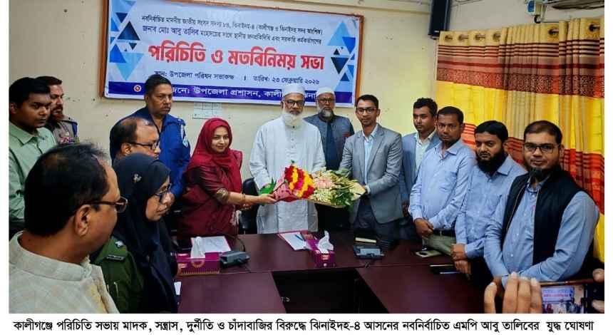 ঝিনাইদহের কালীগঞ্জ উপজেলা-তে আয়োজিত পরিচিতি ও মতবিনিময় সভায় মাদক, সন্ত্রাস, দুর্নীতি ও চাঁদাবাজির বিরুদ্ধে যুদ্ধ ঘোষণা করেছেন ঝিনাইদহ-৪ আসনের নবনির্বাচিত সংসদ সদস্য মাওলানা আবু তালিব। তিনি স্পষ্ট ভাষায় জানান, এলাকায় অপরাধ দমনে প্রশাসনকে সঙ্গে নিয়ে সমন্বিতভাবে কাজ করা হবে এবং কোনো অপশক্তিকে ছাড় দেওয়া হবে না।