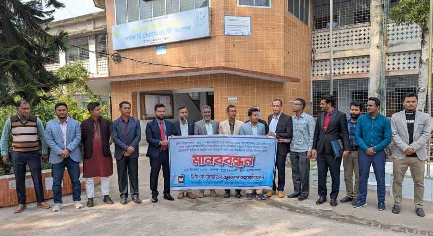 পিরোজপুর সরকারি সোহরাওয়ার্দী কলেজে সাতটি সরকারি কলেজের জন্য প্রস্তাবিত নতুন কাঠামো ও ঢাকা বিশ্ববিদ্যালয়ের অধিভুক্তি সিদ্ধান্তের প্রতিবাদে শিক্ষকেরা মানববন্ধন করেছেন। মঙ্গলবার (৩ ডিসেম্বর) দুপুর ১২টায় বিসিএস জেনারেল এডুকেশন অ্যাসোসিয়েশন, পিরোজপুর সরকারি সোহরাওয়ার্দী কলেজ ইউনিটের উদ্যোগে কলেজ চত্বরে আয়োজন করা হয় এ মানববন্ধন। এতে কলেজের বিভিন্ন বিভাগের শিক্ষকরা উপস্থিত ছিলেন।