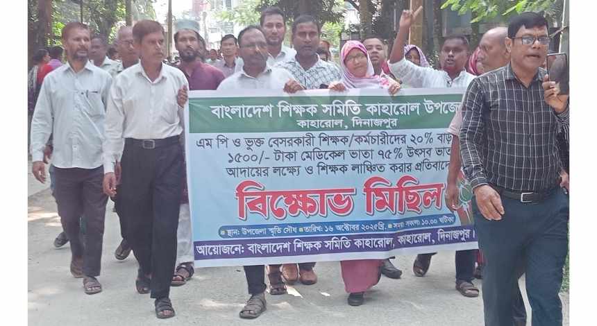 দিনাজপুরের কাহারোল উপজেলায় এমপিওভুক্ত বেসরকারি শিক্ষক ও কর্মচারীদের বিক্ষোভ মিছিল অনুষ্ঠিত হয়েছে। বৃহস্পতিবার (১৬ অক্টোবর ২০২৫) সকাল ১১টায় বাংলাদেশ শিক্ষক সমিতি কাহারোল উপজেলা শাখার উদ্যোগে ২০% বাড়ি ভাতা, ১৫০০ টাকা মেডিকেল ভাতা ও ৭৫% উৎসব ভাতা প্রদানের দাবিতে এই বিক্ষোভ অনুষ্ঠিত হয়।