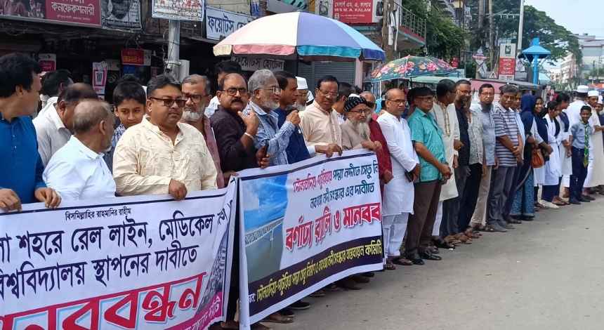 শনিবার সকালে শহরের পোস্ট অফিস মোড়ে এ মানববন্ধনের আয়োজন করে রেললাইন, মেডিকেল কলেজ ও বিশ্ববিদ্যালয় বাস্তবায়ন কমিটি। কর্মসূচিতে জেলার বিভিন্ন রাজনৈতিক, সামাজিক ও পেশাজীবী সংগঠনের প্রতিনিধিরা অংশগ্রহণ করেন।