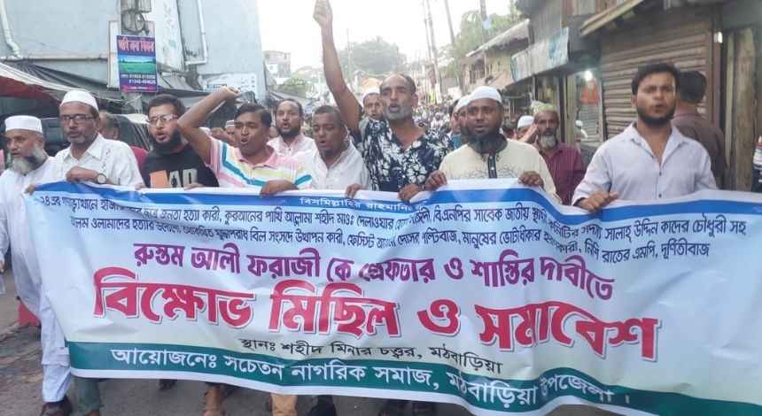 পিরোজপুরের মঠবাড়িয়ায় সাবেক সংসদ সদস্য ড. রুস্তম আলী ফরাজীর গ্রেফতার ও শাস্তির দাবিতে বিক্ষোভ মিছিল ও সমাবেশ করেছে সচেতন নাগরিক সমাজ। বৃহস্পতিবার (২৩ অক্টোবর) বিকেলে কেন্দ্রীয় শহীদ মিনার চত্বরে এ বিক্ষোভ সমাবেশ অনুষ্ঠিত হয়।