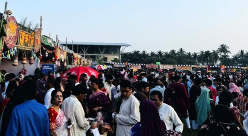 শনিবার (১৮ এপ্রিল) মেলা প্রাঙ্গণে দর্শনার্থীদের উপচে পড়া ভিড় লক্ষ্য করা গেছে। এতে করে উদ্যোক্তাদের বেচাকেনাও বেড়েছে বলে জানিয়েছেন সংশ্লিষ্টরা। বিশেষ করে হাতে তৈরি পোশাক, মাটির তৈরি পণ্য, পাট ও বাঁশের তৈরি সামগ্রী, গৃহস্থালি জিনিসপত্র এবং শিশুদের খেলনার চাহিদা বেশি দেখা যাচ্ছে।