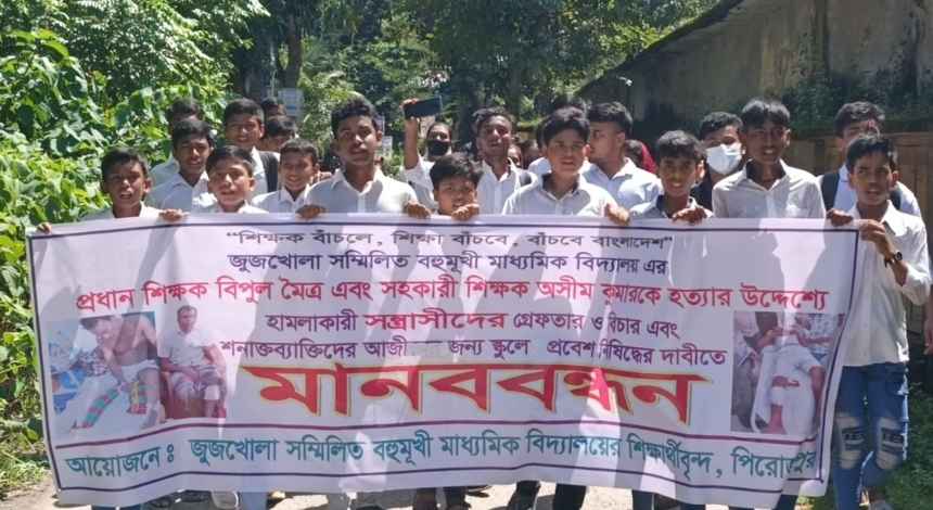 পিরোজপুরের জুজখোলা সম্মিলিত বহুমুখী উচ্চ বিদ্যালয়ের প্রধান শিক্ষক বিপুল মৈত্র (৫২) ও সহকারী শিক্ষক অসীম কুমারের উপর সন্ত্রাসী হামলার প্রতিবাদে মানববন্ধন ও বিক্ষোভ মিছিল করেছে শিক্ষার্থীরা। সোমবার (২৯ সেপ্টেম্বর) বেলা ১১টায় বিদ্যালয়ের সামনে থেকে শিক্ষার্থীরা একটি বিক্ষোভ মিছিল বের করে। মিছিলটি বিভিন্ন সড়ক প্রদক্ষিণ শেষে বিদ্যালয় প্রাঙ্গণে এসে শেষ হয়।