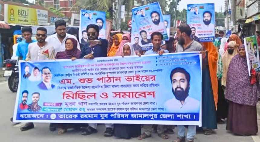 জামালপুর জেলা বিএনপির এক উজ্জ্বল নক্ষত্র, সাবেক ছাত্রনেতা, জেলা যুবদলের সাবেক সহ-সম্পাদক এবং জাতীয়তাবাদী আইন ছাত্র ফোরামের (জেডসিএফ) জামালপুর জেলা শাখার আহ্বায়ক এম. শুভ পাঠানের বিরুদ্ধে দায়েরকৃত রাজনৈতিক উদ্দেশ্যপ্রণোদিত মিথ্যা মামলা প্রত্যাহারের দাবিতে বিক্ষোভ মিছিল ও প্রতিবাদ সমাবেশ অনুষ্ঠিত হয়েছে।