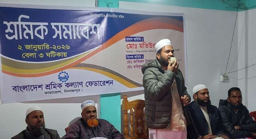 শ্রমিকদের অধিকার, ন্যায়বিচার এবং ইসলামী শ্রমনীতি বাস্তবায়নের লক্ষ্যে দিনাজপুরের কাহারোল উপজেলায় এক শ্রমিক সমাবেশ অনুষ্ঠিত হয়েছে। শুক্রবার (২ জানুয়ারি) বিকাল ৪টায় কাহারোল উপজেলা জামায়াতে ইসলামীর কার্যালয়ে বাংলাদেশ শ্রমিক কল্যাণ ফেডারেশন কাহারোল উপজেলা শাখার উদ্যোগে এই সমাবেশের আয়োজন করা হয়।